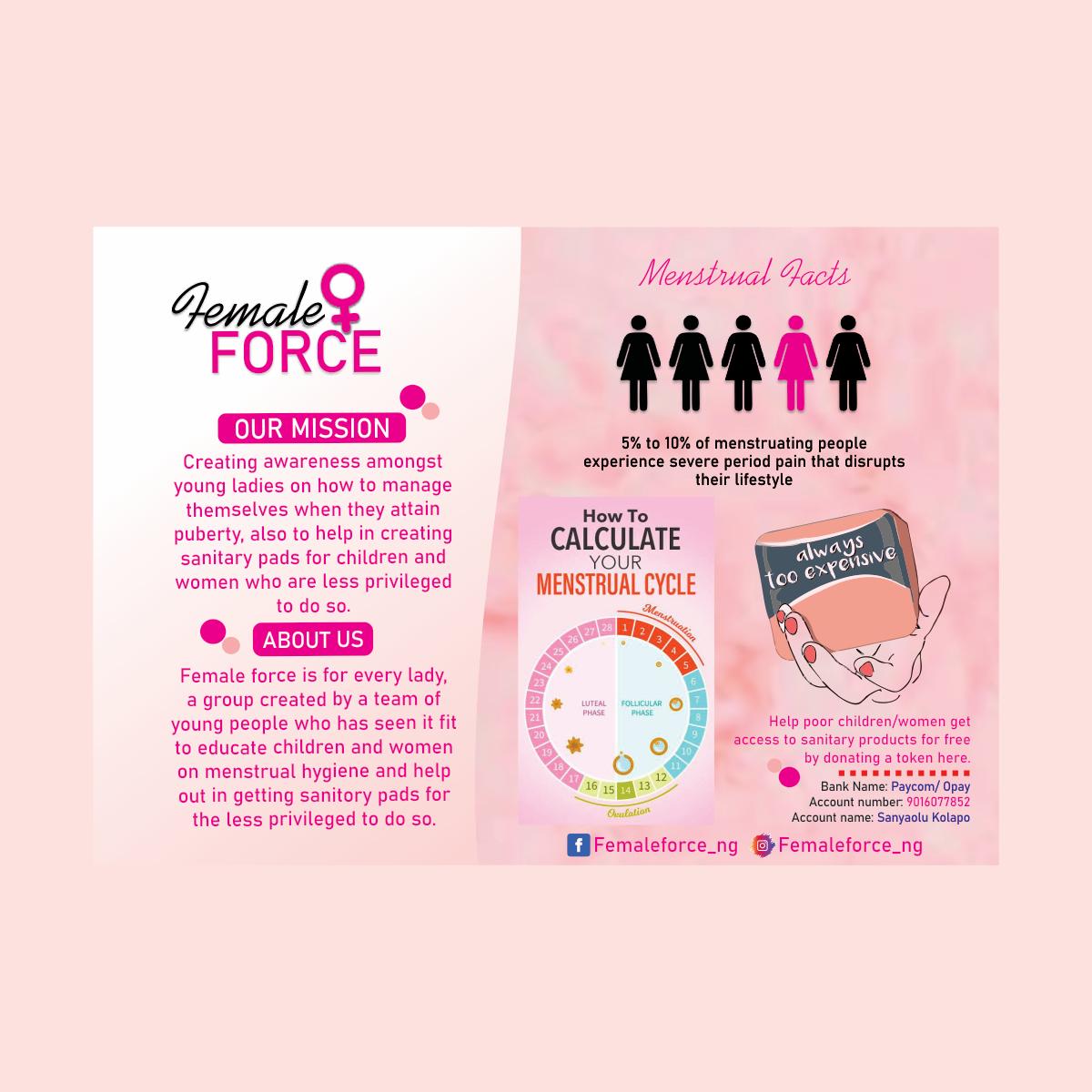 Female force is for every lady, a group created by a team of young people who has seen it fit to educate children and woman on menstrual hygiene and help out in getting sanitary pads for those less privileged to do so.